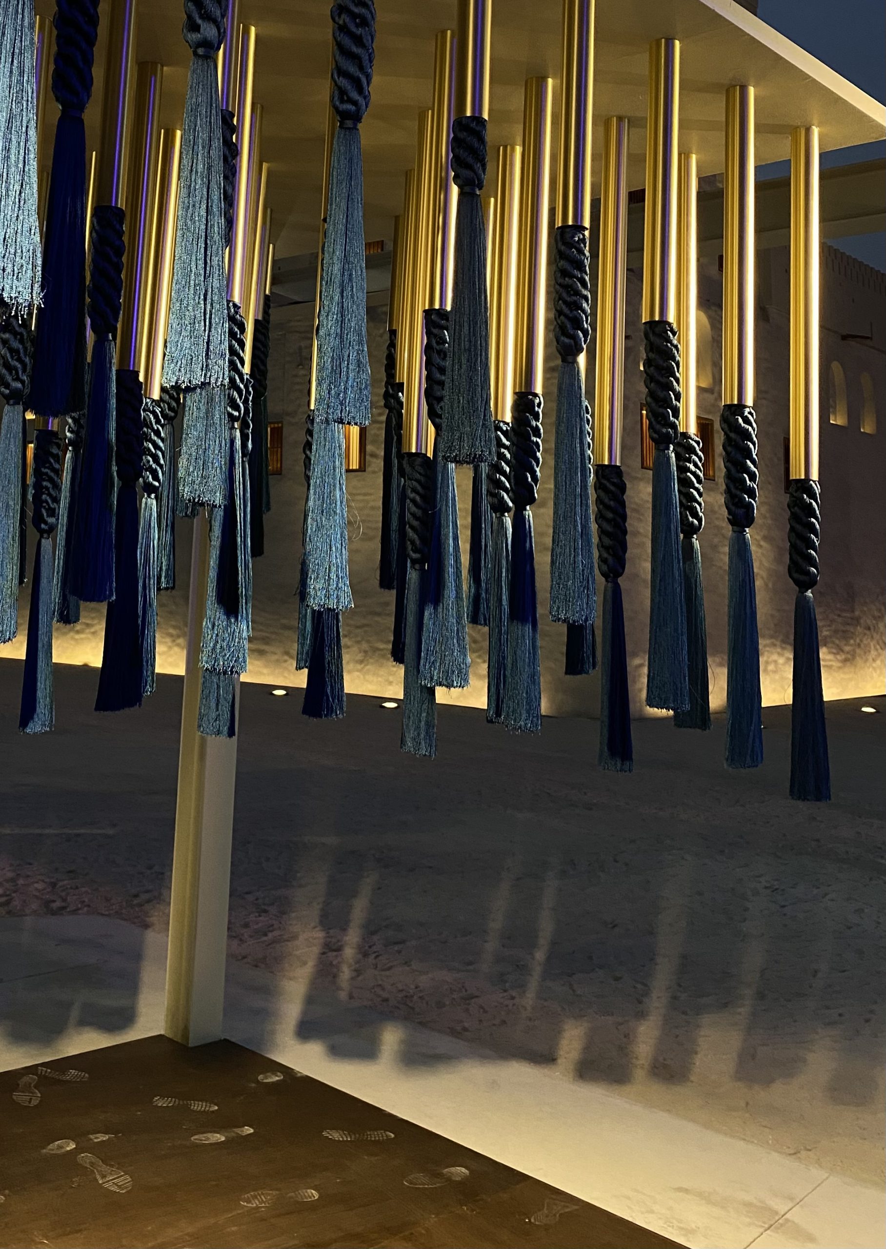 As all the village men prepare to embark on a long and perilous pearl diving voyage in the depths of the Arabian Gulf, she hands him an intricately knotted and fragrantly scented Farookha, which he fastens on his Kandora collar before leaving home. An elegant emblem and a gentle reminder of his loved ones who await his return.